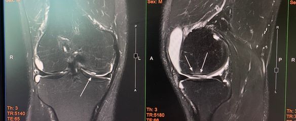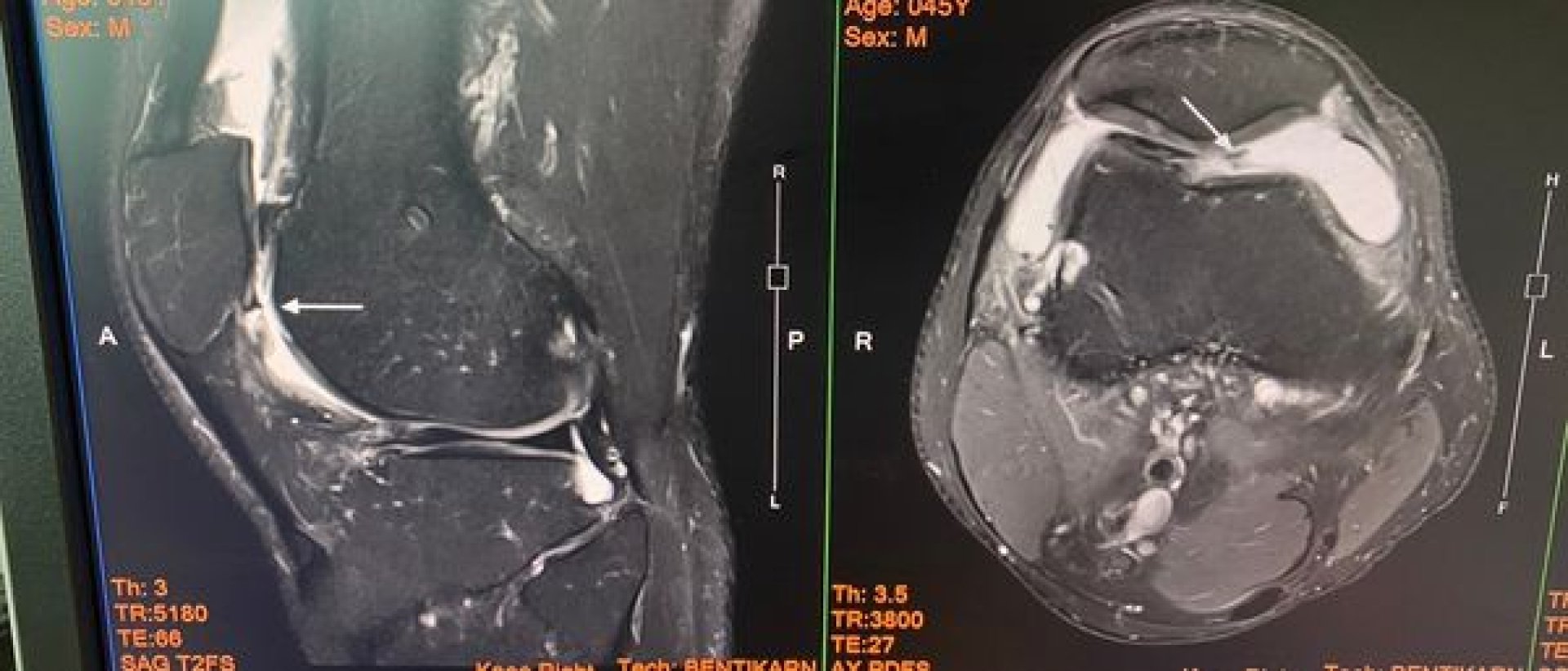 ซึ่งช่วงแรกคนไข้ทำได้ดีมากเลยครับ กลับไปเตะบอลได้หลายเดือน แต่พอเริ่มเตะได้ก็เตะมากขึ้นเวลาในการออกกำลังกล้ามเนื้อน้อยลง กลับมาบวมอักเสบอีกครั้งนึง เลยตัดสินใจส่งคนไข้ไป mri เพื่อดูความเสียหายของผิวข้อตามภาพประกอบ ตรงลูกศรจะเห็นว่า ผิวข้อเสียหายค่อนข้างเยอะ ทะลุลึกพอสมควรเลย รวมถึงมีตัวกระดูกอ่อนผิวข้อมีการหลุด แล้วคาขัดอยู่ในข้อด้วย ซึ่งอาจจะเป็นสาเหตุทำให้เหยียดเข่าได้ไม่สุด